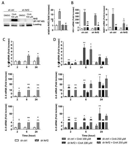 In sh Nrf2 cells, CinA 100 µM failed to induce NQO1 mRNA transcription, while HO-1 was only slightly increased (Figure 4B). At a steady state, the absence of Nrf2 in KC increased the basal levels of IL-1β, IL-6, and IL-8 transcription (Figure 4C). In response to CinA 100 µM, the downregulation of IL-1β was abrogated in Nrf2-deficient cells, and transcription and secretion of the cytokines previously tested were significantly increased. For KC stimulated with 250-µM CinA, proinflammatory cytokines were increased at 2 and 6 h in the absence of Nrf2 compared to control cells. Interestingly, the mRNA levels of proinflammatory cytokines rise to the same level in Nrf2-deficient cells in response to both 100 µM and 250 µM of CinA (Figure 4D).