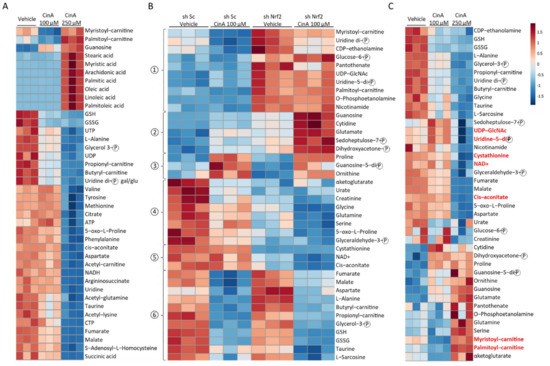 CinA and Nrf2 modify intracellular metabolites profiles in KCs. KCs were invalidated for Nrf2 by transduction with lentiviral particles to express a short-hairpin RNA targeting Nrf2 (sh Nrf2) or a scrambled short-hairpin (sh ctrl) as the control cells, and the cells were exposed to 100 or 250 µM of CinA for 1 h, followed by a metabolomic analysis by mass spectrometry. (A) Heatmap representing the 40 highest and most significant p-values from the comparison of sh ctrl cells exposed to CinA (100 or 250 µM) and DMSO 0.1% as the control. (B) Heatmap representing the 40 highest and most significant p-values from the comparison of sh ctrl and sh Nrf2 cells exposed to 100 µM of CinA or DMSO 0.1% as the control. (C) Heatmap representing the same metabolites as panel B for the comparison of sh ctrl cells exposed to CinA (100 or 250 µM) and DMSO 0.1% as the control. Data represent the results of 3 independent experiments.