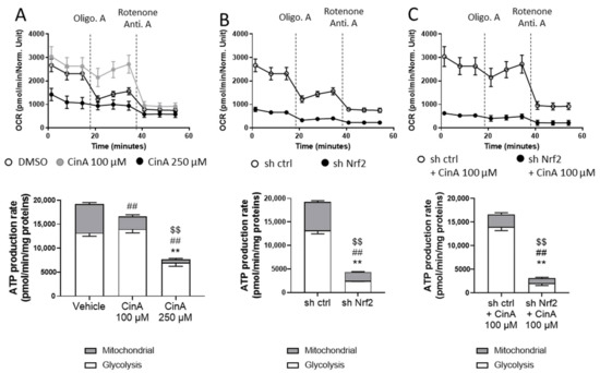 Since the metabolomic analyses revealed different profiles regarding the concentration of CinA and Nrf2 expression, energetic metabolism using seahorse technology has been studied. We used the ATP rate assay kit to determine the oxygen consumption rate (OCR) and extracellular acidification rate (ECAR), allowing us to determine the respective amounts of ATP synthetized by glycolysis and mitochondria. OCR, which is related to mitochondrial activity and oxidative phosphorylation (OXPHOS), was slightly increased in response to CinA 100 µM compared to the vehicle cells. After the Oligomycin A treatment, this difference markedly increased, since the OCR dropped only for vehicle-treated cells. For CinA 250 µM, the level of OCR was very low (Figure 6A, upper panel). The total ATP production was not statistically different between these two groups, but CinA 100 µM-treated cells relied more on glycolysis to produce ATP (Figure 6A, lower panel). For ECAR, which is related to glycolysis, it was not affected by CinA 100 µM but greatly reduced in response to CinA 250 µM (Figure S5a). At a steady state, the sh Nrf2 was responsible for a very important decrease of ATP synthesis, with a drop in both OCR and ECAR. (Figure 6B and Figure S5b). The treatment of sh Nrf2 cells by CinA 100 µM did not show any metabolic switch, as for Nrf2-competent cells, further indicating that, as previously hypothesized, the protective effects of CinA 100 µM are most likely related to Nrf2 activity (Figure 6C and Figure S5c).