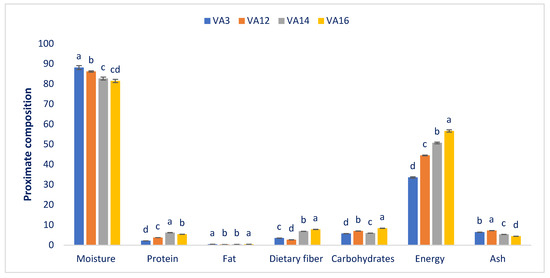 The moisture, protein, fat, dietary fiber, carbohydrate, energy, and ash contents of drought-resistant amaranth (g 100 g−1 FW). Dissimilar letters indicate statistical significance according to the Duncan Multiple Range Test (DMRT) (p < 0.01), (n = 3).
