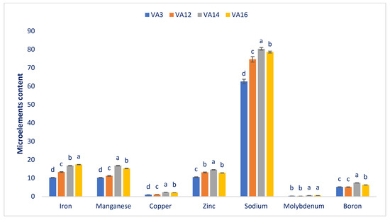 The macro and microelements in the selected drought-resistant amaranths are shown in Figure 2 and Figure 3, respectively. The drought-resistant accessions showed remarkable variations in calcium (1.72 to 3.28 mg g−1 FW), phosphorus (0.62 to 1.81 mg g−1 FW), and sulfur (0.55 to 1.34 mg g−1 FW) content. The drought-resistant accession VA14 had the highest contents of potassium (7.56 mg g−1 FW), calcium (3.28 mg g−1 FW), phosphorus (1.81 mg g−1 FW), and sulfur (1.34 mg g−1 FW), albeit the maximum magnesium content (3.27 mg g−1 FW) was noted in VA16. On the other hand, VA12 had the lowest potassium (4.33 mg g−1 FW), phosphorus (0.62 mg g−1 FW), sulfur (0.55 mg g−1 FW), and magnesium (2.50 mg g−1 FW) contents. Accession VA16 had the lowest calcium content (1.72 mg g−1 FW) (Figure 2). We obtained ample potassium, calcium, magnesium, phosphorus, and sulfur in the drought-resistant amaranth. Chakrabarty et al. [18] in A. lividus also demonstrated the same results. In the literature, several amaranth species [63] reported ample magnesium, potassium, phosphorus, calcium, and sulfur. They also mentioned that amaranth’s magnesium, potassium, phosphorus, calcium, and sulfur contents were much more pronounced than spider flower, kale, spinach, and black nightshade.