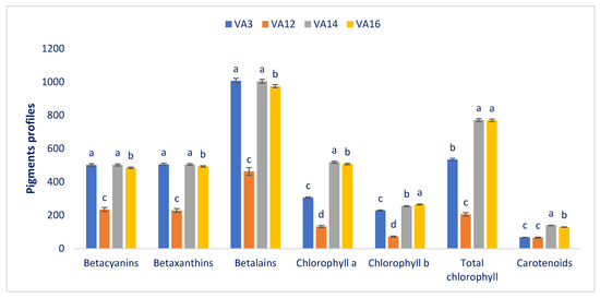 The pigment contents of four drought-resistant amaranths are shown in Figure 4. The drought-resistant amaranths had ample betalains, betaxanthins, and betacyanins, though the amounts varied significantly among the drought-resistant accessions (462.99 to 1007.09, 228.66 to 505.35, and 234.33 to 502.13 ng g−1 FW, respectively). The drought-resistant accessions VA14 and VA3 exhibited the maximum betacyanin contents (502.13 and 501.73 ng g−1 FW, respectively), followed by VA16 (484.55 ng g−1 FW). Conversely, the drought-resistant accession VA12 had the lowest betacyanin content (234.33 ng g−1 FW). Among the drought-resistant accessions, significant and pronounced variations were observed in betaxanthin content. The drought-resistant accession VA3 had the highest betalain and betaxanthin contents (1007.09 and 505.35 ng g−1 FW), and these values are statistically similar to those of drought-resistant accession VA14. In contrast, the drought-resistant accession VA12 showed the lowest betaxanthin and betalain contents (228.66, 462.99 ng g−1 FW). Chlorophyll a displayed significant and notable variations among accessions (132.45 to 518.16 µg g−1 FW). The drought-resistant accession VA14 had the maximum chlorophyll a content (518.16 µg g−1 FW), whereas the lowest chlorophyll a content was recorded in the drought-resistant accession VA12 (132.45 µg g−1 FW). Likewise, marked and significant differences in chlorophyll b content were observed in the drought-resistant amaranth accessions (72.55 to 264.13 µg g−1 FW). The drought-resistant accession VA16 had the maximum chlorophyll b content (264.13 µg g−1 FW), followed by the drought-resistant accession VA14 (254.58 µg g−1 FW). Conversely, the drought-resistant accession VA12 had the lowest chlorophyll b (72.55 µg g−1 FW). The drought-resistant accession of amaranth exhibited a significant and noticeable variation in total chlorophyll content (205.00 to 771.49 µg g−1 FW). The drought-resistant accessions VA14 and VA16 exhibited ample total chlorophyll contents, whereas the drought-resistant accession VA12 had the lowest total chlorophyll content (205.00 µg g−1 FW). Carotenoids showed significant and notable variations among accessions (66.58 to 138.79 mg 100 g−1 FW). The drought-resistant accession VA14 had the maximum carotenoid content (138.79 mg 100 g−1 FW), whereas the lowest carotenoid was recorded in the drought-resistant accession VA12 (66.58 mg 100 g−1 FW).