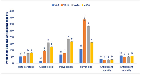 The drought-resistant amaranth varied markedly and significantly in polyphenol content, beta-carotene content, flavonoid content, ascorbic acid content, and antioxidant capacity (AC) (Figure 5). The beta-carotene in the drought-resistant accessions had pronounced variations (52.42 mg 100 g−1 FW in the drought-resistant accession VA3 to 81.25 mg 100 g−1 FW in the drought-resistant accession VA16). The ascorbic acid content of the drought-resistant accessions varied from 16.54 mg 100 g−1 FW in the drought-resistant accession VA3 to 158.54 mg 100 g−1 FW in the drought-resistant accession VA14. Polyphenols ranged from 66.54 (VA3) to 184.25 µg GAE g−1 FW (VA14). The drought-resistant accession VA14 had the maximum polyphenol content, followed by the drought-resistant accession VA16. The flavonoid content exhibited ample variation regarding the drought-resistant amaranth accessions (112.38 µg RE g−1 DW in the drought-resistant accession VA3 to 335.47 µg RE g−1 DW in the drought-resistant accession VA12). The AC (DPPH) of the drought-resistant amaranth ranged from 25.86 (VA12) to 32.34 µg TEAC g−1 DW (VA3).