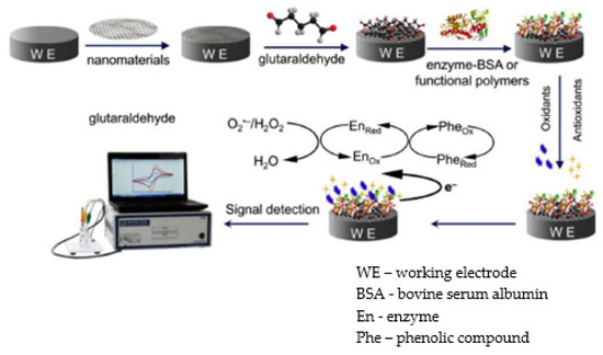 Major progress regarding biosensors based on enzymes is linked to the immobilization and functionality of the biological material interface on the surface of the electrode [134]. Despite the good performances and the significance of this technology for applied and fundamental science, it should be noted that there are several important aspects which need to be taken into consideration before the commercial application of enzymatic biosensors to monitor active compounds and their antioxidant activity. One such aspect is related to the immobilization and the stability of the enzyme. Very efficient enzymatic immobilization and acceleration of the electron transfer rate are challenging tasks in developing biosensors. Along these lines, for an enzymatic immobilization with high efficiency and long-term stability, various nanomaterials or polymeric membranes, established and selected depending on the desired effects, can be integrated in biosensors [135].