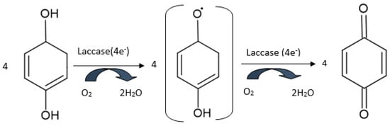 Laccase belongs to the multi-copper oxidase (MCO) family, i.e., a group which includes many enzymes with different specificities for different substrate and various biological functions. Lacasse is made up of four copper atoms (copper type 1; copper type 2; and two copper type 3 atoms), which form the active site of the enzyme [119]. This enzyme catalyzes the oxidation of phenols, diphenols, and other polyphenols at quinone derivatives, without requiring H2O2 as a co-substrate [120]. Figure 6 shows the oxidation mechanism of phenolic compounds by laccase. Similarly, with the biosensors based on tyrosinase, reducing the generated quinone enzymatic derivatives supplies the electrochemical signal for the obtained biosensors [109]. In fact, the antioxidant activity is measured using a standard compound-like caffeic acid, catechin, chlorogenic acid, or catechol, and the respective compound displays good electrochemical behavior on the surface of the electrode [121]. From among the redox enzymes, laccase has very good stability, which makes it ideal for antioxidant analysis.