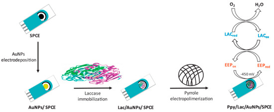 Another study was aimed to develop an electrochemical biosensor for the determination of polyphenols in propolis samples. The construction of the biosensor is based on immobilizing a nanocomposite film of the laccase enzyme on AuNP, electrodeposited on the surface of a SPCE modified with polypyrrole (Ppy) through a process of in situ electro polymerization (Figure 7). The electrodepositing of gold nanoparticles facilitated an increase in the surface available for immobilizing laccase. The Ppy/Lac/AuNPs/SPCE nanocomposite film was characterized by electronic scanning microscopy and energy-dispersive X-ray spectroscopy, as well as through CV. In the presence of the propolis extract, which contains phenolic compounds, immobilized laccase oxidates the polyphenols and, later, these compounds are reduced on the surface of the electrode modified through amperometry at −450 mV. The linear range was between 1 and 250 µM, expressed as caffeic acid, and the detection limit was 0.83 µM. The time necessary for the analysis was 15 min, which was shorter compared to the time necessary for the spectrophotometric methods (85 min), especially for the Folin-Ciocalteu method. The biosensor developed had good selectivity, stability, and reproducibility which helped to detect polyphenols in the propolis samples [124].