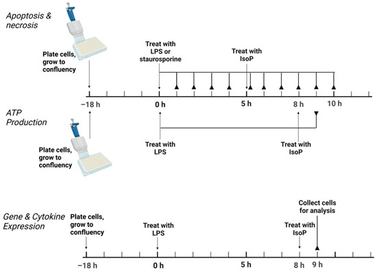 Experimental design to test the effect of 15F2tisoprostane on RAW 264.7 macrophage polarization. For apoptosis, necrosis, and ATP production, the solid lines ending in reverse arrowheads represent timepoints when plates were read on a Tecan Infinite 200 Pro. For gene and cytokine expression, the solid line ending in a reverse arrowhead represents the point at which cells were collected for further analysis. LPS—lipopolysaccharide; IsoP—isoprostane; h—hour.