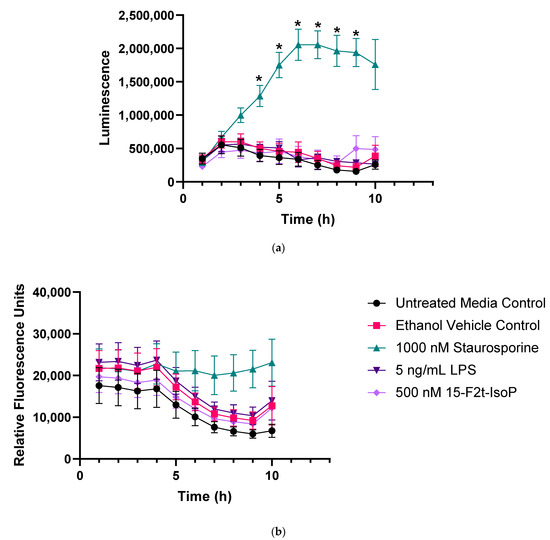 Endotoxin and 15F2t-Isoprostane do not cause apoptosis or necrosis in RAW 264.7 macrophages (n = 7). (a) Mean luminescence, representative of apoptosis; * increased luminescence in the staurosporine treatment group at a given time point (p < 0.05). (b) Mean fluorescence, resulting from necrosis secondary to apoptosis. Statistical analyses included a linear mixed effects model with Tukey’s HSD posthoc test. LPS—lipopolysaccharide; IsoP—Isoprostane; h—hour.