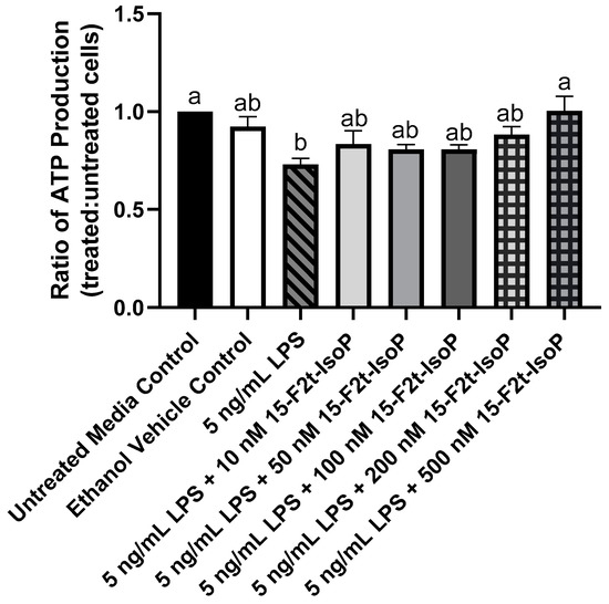 ATP production in RAW 264.7 macrophages (n = 7) is altered by 15-F2t-isoprostane during endotoxin challenge. Statistical analyses included a one-way ANOVA with Tukey’s HSD posthoc test. a,b Different superscripts are different (p < 0.05). LPS—lipopolysaccharide; IsoP—isoprostane.