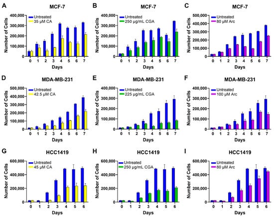 IC50 concentrations of CA, CGA, and Arc-treated breast cancer cells over time. Cell growth was determined by counting the number of cells in each group on each day. IC50 concentrations of (A) CA-treated MCF-7 cells, (B) CGA-treated MCF-7 cells, (C) Arc-treated MCF-7 cells, (D) CA-treated MDA-MB-231 cells, (E) CGA-treated MDA-MB-231 cells, (F) Arc-treated MDA-MB-231 cells, (G) CA-treated HCC1419 cells, (H) CGA-treated HCC1419 cells, and (I) Arc-treated HCC1419 cells. Each bar represents the mean ± SEM of three biological replicates (n = 3).