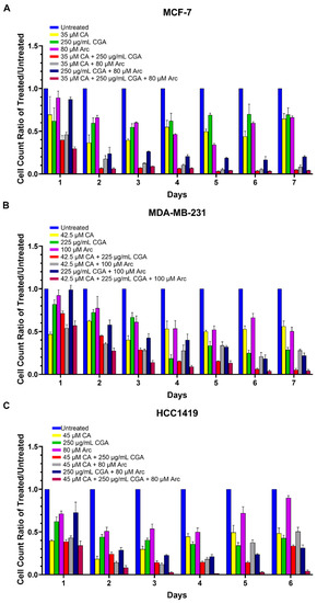 Breast cancer cell growth curves treated with combinations of CA, CGA, and Arc in (A) MCF-7, (B) MDA-MB-231, and (C) HCC1419 cells. Cell growth was determined by counting the number of cells in each group on each day for 6/7 days. Each bar represents the mean ± SEM of three biological replicates (n = 3). Groups were compared using a one-way ANOVA. The results of the statistical analysis are summarized in Tables S1–S3. Cell growth differences between groups were considered significant at p ≤ 0.05.