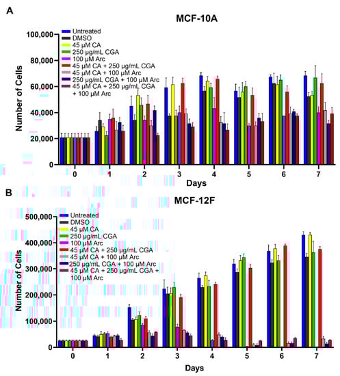 Normal mammary epithelial cell growth curves of (A) MCF-10A and (B) MCF-12F cells treated with 45 µM of CA, 250 µg/mL of CGA, and 100 µM of Arc, alone and in combination. Cell growth was determined by counting the number of cells in each group on each day for 7 days. Each bar represents the mean ± SEM of three biological replicates (n = 3). The groups were compared using a one-way ANOVA. The results of the statistical analysis are summarized in Tables S7 and S8. Cell growth differences between groups were considered significant at p ≤ 0.05.