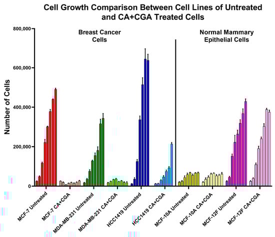 Cell growth comparison of untreated and CA + CGA-treated breast cancer and normal mammary epithelial cells. CA + CGA treatment significantly reduced breast cancer cell growth compared to untreated breast cancer cells, but did not cause cell growth reductions in normal mammary epithelial cells. Cell growth was determined by counting the number of cells in each group on each day for 6/7 days. Each bar represents the mean ± SEM of three biological replicates (n = 3).
