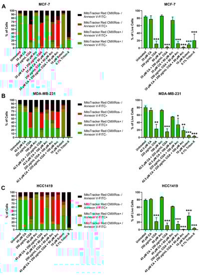 Cell death and live cell percentages in (A) MCF-7, (B) MDA-MB-231, and (C) HCC1419 breast cancer cells treated with CA, CGA, and Arc, alone or in combination, for 96 h. Green bars represent cells that are ΔΨm-positive and annexin V-negative (live cells); brown bars denote cells that are ΔΨm-positive and annexin V-positive (early cell death); red bars show cells that are ΔΨm-negative and annexin V-positive (late cell death); and black bars represent cells that are ΔΨm-negative and annexin V-negative (late cell death). Each green bar in the % live cell graphs represents the mean of means ± SEM from 3 biological and experimental replicates (n = 3) showing the percentage of live cells at 96 h. Twenty-four-hour 10 µM Sutent treatment was used as a positive control for Annexin V-FITC and 30 min 0.1% Triton-X treatment was used as a double-negative staining control. The groups were compared using a one-way ANOVA. Differences in the percentage of live cells between groups were considered significant at p ≤ 0.05. Statistical significance compared to untreated: * = p < 0.05; ** = p < 0.01; *** = p < 0.001.