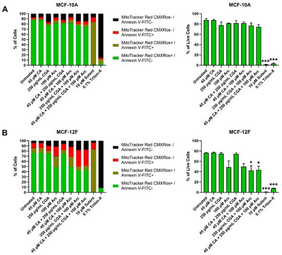 Cell death and live cell percentages in (A) MCF-10A and (B) MCF-12F normal mammary epithelial cells treated with CA, CGA, and Arc, alone or in combination, for 96 h. Green bars represent cells that are ΔΨm-positive and annexin V-negative (live cells); brown bars denote cells that are ΔΨm-positive and annexin V-positive (early cell death); red bars show cells that are ΔΨm-negative and annexin V-positive (late cell death); black bars represent cells that are ΔΨm-negative and annexin V-negative (late cell death). Each green bar in the % live cell graphs represents the mean of means ± SEM from 3 biological and experimental replicates (n = 3) showing the percentage of live cells at 96 h. Twenty-four-hour 10 µM Sutent treatment was used as a positive control for Annexin V-FITC and 30 min 0.1% Triton-X treatment was used as a double-negative staining control. The groups were compared using a one-way ANOVA. Differences in the percentage of live cells between groups were considered significant at p ≤ 0.05. Statistical significance compared to untreated: * = p < 0.05; *** = p < 0.001.