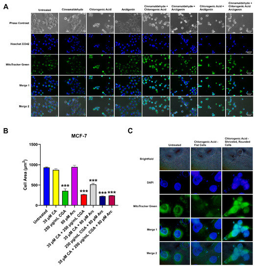 MCF-7 and MCF-10A cells were seeded at a density of 20,000 cells/well into 48-well plates and allowed to grow for 24 h. The cells were then treated with single and combination treatments of CA, CGA, and Arc, or fresh medium for the untreated group, for 6 h and 24 h. After 6 h or 24 h, the cells were incubated with MitoTracker® Green FM (Sigma–Aldrich, Saint Louis, MO, USA) to a final concentration of 150 μM of MitoTracker® Green FM for 30 min and Hoechst 33342 to a final concentration of 1 μg/mL for 15 min at 37 °C by direct addition to cell medium and subsequent mixing. After incubation, the cells were washed once with warm PBS and FluoroBriteTM DMEM medium (Sigma–Aldrich, Saint Louis, MO, USA) was added for cell imaging. The cells were imaged using the EVOS™ M7000 Imaging System (Invitrogen, Waltham, MA, USA). The cells were visualized with a 40× objective and DAPI (Ex: 357/44; Em: 447/60) and GFP (Ex: 482/25; Em: 524/24) filter cubes. All settings were kept equal between samples of the same cell lines and between biological replicates. The images were processed and analyzed using FIJI []. All brightness/contrast adjustments were kept equal between all samples of the same cell lines. The MCF-7 cell area was determined by manually drawing around individual cells in phase–contrast images and measuring the area in FIJI.