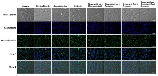 Representative fluorescence microscopy images of MCF-10A cells treated with 45 µM CA, 250 µg/mL CGA, and 100 µM Arc, alone and in combination, for 24 h. After 24 h treatment, cells were stained with final concentrations of 150 µM MitoTracker® Green FM and 1 μg/mL of Hoechst 33342 before visualization at 40× magnification (scale bar = 75 µm).