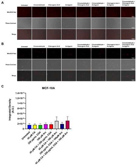 MCF-7 and MCF-10A cells were seeded at 40,000 cells/well into 24-well plates and allowed to grow for 24 h. MitoSOX™ Red (ThermoFisher Scientific, Waltham, MA, USA) staining solution was prepared on the day of the experiment by dissolving the vial contents into 13 μL of DMSO for the stock solution. To produce the working solution, MitoSOX™ Red was diluted in HBSS/Ca/Mg (Gibco, Waltham, MA, USA) for a 5 μM solution. The cells were treated with single and combination treatments of CA, CGA, and Arc, or fresh medium for the untreated group, for 2 h. The medium was then removed, and the cells were washed with warm PBS. The cells were stained with 5 μM MitoSOX™ Red for 10 min at 37 °C. Afterward, the cells were washed twice with warm PBS. For cell imaging, warm FluoroBriteTM DMEM (Gibco, Waltham, MA, USA), free of Phenol Red and L-Glutamine, was added to the cells. The cells were visualized with 10× and 40× objectives and the RFP filter cube (Ex: 531/40; Em: 593/40) using the EVOS™ M7000 Imaging System (ThermoFisher Scientific, Waltham, MA, USA). All settings were kept equal between samples of the same cell lines and between experimental replicates. The images were processed and analyzed using FIJI []. For proper thresholding, the adaptive thresholding plugin by Qingzong Tseng, Ph.D., was used. All brightness/contrast adjustments were kept equal between all samples of the same cell line. Mitochondrial superoxide production was determined by calculating the integrated densities in FIJI.