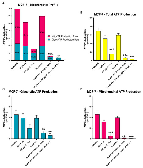 Bioenergetic profile and total, glycolytic, and mitochondrial ATP production in MCF-7 breast cancer cells treated with 35 µM CA, 250 µg/mL CGA, and 80 µM Arc, for 48 h. (A) Each bar represents the mean of mean ATP production rate (pmol/min) values from 3 biological and 4 experimental replicates (n = 4). Percentages denote the proportion of the total ATP production rate generated by the mitochondria (red) and by glycolysis (blue). (B) Total, (C) glycolytic, and (D) mitochondrial ATP production rates in MCF-7 breast cancer cells. Each bar represents the mean ± SEM of the ATP production rate (pmol/min) values from 3 biological and 4 experimental replicates (n = 4). Groups were compared using a one-way ANOVA. Differences in the total, glycolytic, and mitochondrial ATP production between groups were considered significant with p ≤ 0.05. Statistical significance compared to untreated: ** = p < 0.01; *** = p < 0.001.