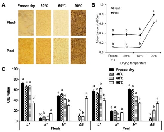 Visual color changes of astringent persimmon fruit (coarsely ground powder) dried at different temperatures: (A) browning value of the MRPs (Maillard reaction products) by absorbance at 420 nm; and (B) their CIE L*, a*, and b* values and color difference (ΔE); (C) different letters in each parameter of each sample of flesh and peel indicate significant differences at p < 0.05 (Tukey’s HSD test).