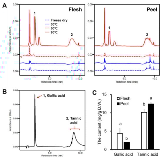 HPLC chromatograms of (A) the extracts of flesh and peel dried at different temperatures, (B) hydrolysable tannin standards (gallic and tannic acids), and (C) the content of gallic and tannic acids in the 90 °C dried flesh and peel. Different letters between the flesh and peel of each compound in Figure 4C indicate significant differences at p < 0.05 (Tukey’s HSD test).