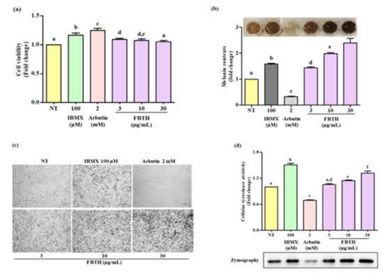 Effects of melanogenesis by FBTH in Melan-A cells. (a) Cells (1 × 105 cells/mL) were seeded in 24-well plates and incubated with the FBTH or IBMX or arbutin for three days, and the cell viability was measured by the MTT assay. (b) Cells were treated with samples or compounds for three days; after washing with PBS twice, the cells were collected and dissolved in NaOH, then the melanin contents were measured at 405 nm. IBMX was used as a positive control, and arbutin was used as a negative control. (c) Cells were treated with samples or compounds for three days, and then washed using PBS twice and photographed using a Nikon microscope and camera (Eclipse, TE-2000U, Nikon, Tokyo, Japan). (d) Melan-A cells were cultured with FBTH for three days. After the tyrosinase was extracted, the cellular tyrosinase activity and zymography were performed according to the described method. Data are expressed as the mean ± SD (n = 3). All tests were performed in triplicate. Different letters stand for statistically significant each other (p < 0.05) performed by one-way ANOVA followed by Tukey’s test.