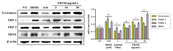 Effects of the FBTH on the expression of melanogenesis-related proteins in Melan-A cells. Cells (1 × 105 cells/mL) were cultured with FBTH for 72 h, and the protein levels were analyzed by Western blotting, and the statistical analysis of protein band density was shown. IBMX (100 μM) was used as the positive control, and arbutin (2 mM) was used as the negative control. NT: No treatment. Data are expressed as the mean ± SD (n = 3). All tests were performed in triplicate. Different letters stand for statistically significant each other (p < 0.05) performed by one-way ANOVA followed by Tukey’s test.