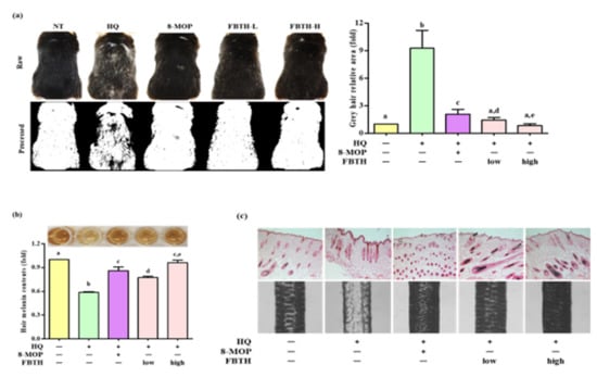 Repression of hair graying on C57BL/6 mice by FBTH. (a) After exposure to FBTH with or without HQ for two months, the whole mice were photographed using a Nikon camera (Raw). The gray hair coverage of the whole mouse dorsum was processed as a binary image using ImageJ software (processed). 8-MOP was used as a positive control. NT, vehicle group; HQ, hydroquinone control group; FBTH-L, low concentration (50 mg/kg/day) of the FBTH group; FBTH-H, high concentration (100 mg/kg/day) of the FBTH group. ImageJ software was used to quantify the gray hair area. (b) Melanin contents of C57BL/6 mice hair shafts. At the end of the schedule, hair shafts were collected and washed twice using deionized water to remove the sample color and impurities. The hair was dissolved in NaOH, and melanin content was measured at 405 nm after clear drying. (c) Fontana-Masson staining of dorsal skin sections from the mice showed differences in hair follicle melanin content (top). Melanin biosynthesis in the hair shafts of C57BL/6 mice (bottom). Three independent data are collected, and the classical feature is shown. For statistical analysis, different letter indicated that they are statistically significant each other.