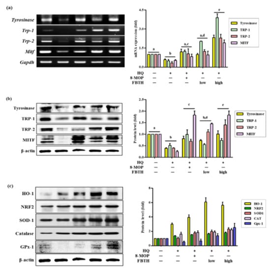 Comparison of mRNA and protein expression of melanogenesis and antioxidant related genes on hydroquinone-induced hair graying in C57BL/6 mice. (a–c) C57BL/6 mice were treated with FBTH and hydroquinone every day for two months. Then, the dorsal skin was collected, and the mRNA (a) or protein expressions (b) of melanogenesis related gene and protein expression of antioxidant related genes (c) were analyzed by RT-PCR and immunoblotting. Respectively. 8-MOP was used as a positive control. NT, vehicle group; HQ, hydroquinone control group; FBTH-L, low concentration (50 mg/kg/day) of the FBTH group; FBTH-H, high concentration (100 mg/kg/day) of the FBTH group. For statistical analysis, different letter indicated that they are statistically significant each other.