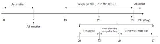 Aβ25–35 peptide (Sigma Aldrich, St. Louis, MO, USA) was aggregated as previously described by Maurice et al. [18]. The Aβ25–35 peptide was dissolved in saline solution (0.9% NaCl) to a concentration of 1 mg/mL and incubated at 37 °C for 3 days to induce aggregation. Aβ25–35 was injected into the mice brain as described by Laursen and Belknap [19]. Mice were lightly anesthetized with zoletil50 (Virbac Korea, Seoul, Korea) and rompun (Bayer Korea, Seoul, Korea) mixture by intraperitoneal (i.p.) injection, and the aggregated Aβ25–35 was injected precisely 0.8 mm posterior to the bregma and 1.5 mm lateral to the sagittal suture. All injections were administered via a 26-gauge needle that was inserted 2.2 mm beneath from the surface of the brain using a microinfusion pump (Boading Longer Precision Pump Co., Ltd., Baoding, China). Animals were injected with 5 μL saline solution (0.9% NaCl) or 5 nmol Aβ25–35 in the cerebral lateral ventricle at a flow rate of 1 μL/min. The behavioral experimental schedule for mice injected with Aβ25–35 is shown in Figure 1.