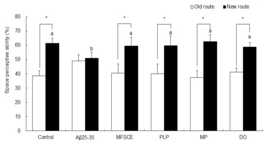 Effect of MFSCE on space perception ability using the T-maze test in Aβ25–35-injected mice. a,b Means with different letters are significantly different (p < 0.05) from each group in test session. Data are expressed as mean ± SD (n = 6). * The space perception abilities for the old and new routes are significantly different as analyzed by the Student’s t-test (p < 0.05). Control group: 0.9% NaCl saline i.c.v. + 0.9% NaCl saline i.p.; Aβ25–35 group: Aβ25–35 i.c.v. + 0.9% NaCl saline i.p.; MFSCE group: Aβ25–35 i.c.v. + MFSCE (100 mg/kg) i.p.; PLP group: Aβ25–35 i.c.v. + PLP (1 mg/kg) i.p.; MP group: Aβ25–35 i.c.v. + MFSCE (100 mg/kg) and PLP (1 mg/kg) i.p.; DO group (positive control): Aβ25–35 i.c.v. + donepezil (5 mg/kg) i.p. injection.