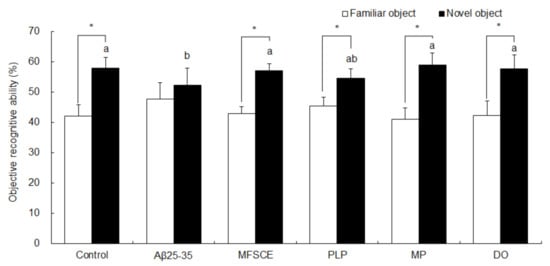 To determine the ability of memory recognition, the NOR test was performed after the T-maze test. In the NOR test, mice were exposed to two identical objects, and one object was then replaced by a novel object. As illustrated in Figure 3, the control group of mice were able to discriminate between familiar and novel objects, showing an increase in time spent exploring novel object in relation to time spent exploring a familiar object (Student’s t-test, p = 0.000). However, Aβ25–35-injected mice exhibited no significant differences in preference for familiar or novel object (Student’s t-test, p = 0.109), demonstrating that mice injected with Aβ25–35 did not remember the object that they were exposed to in the previous trial. Compared to the Aβ25–35-injected group, treatment with MFSCE, PLP, MP, or DO induced a significantly higher preference for the novel object compared to a familiar object (Student’s t-test, p = 0.109), indicating that MFSCE, PLP, and MP prevented Aβ25–35-induced object perception impairment.