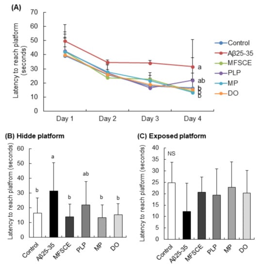 Effect of MFSCE on the spatial memory ability in the Morris water maze test in Aβ25–35-injected mice. (A) Effects of MFSCE on the escape latency to the platform during 4 days in the Morris water maze test in Aβ25−35-injected mice. (B) Effects of MFSCE on latency to reach the hidden platform. (C) Effects of MFSCE on the latency to reach the exposed platform. Data are expressed as mean ± SD (n = 10). a,b Means with different letters are significantly different (p < 0.05) from each other. NS: no significance. Control group: 0.9% NaCl saline i.c.v. + 0.9% NaCl saline i.p.; Aβ25–35 group: Aβ25–35 i.c.v. + 0.9% NaCl saline i.p.; MFSCE group: Aβ25–35 i.c.v. + MFSCE (100 mg/kg) i.p.; PLP group: Aβ25–35 i.c.v. + PLP (1 mg/kg) i.p.; MP group: Aβ25–35 i.c.v. + MFSCE (100 mg/kg) and PLP (1 mg/kg) i.p.; DO group (positive control): Aβ25–35 i.c.v.+ donepezil (5 mg/kg) i.p. injection.