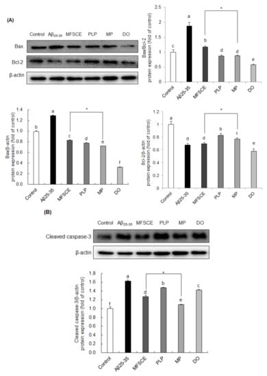Numerous studies have demonstrated the involvement of neuronal apoptosis in AD [42,43,44]. The Aβ within the brain can induce neurotoxic substances, including cytokines, ROS, and RNS, which ultimately result in neuronal cell death [45,46,47]. The Bcl-2 family plays a crucial role in the mitochondrial apoptosis pathway, and they are composed of the antiapoptotic protein Bcl-2 and the proapoptotic protein Bax. Furthermore, Bax overexpression following activation of the apoptotic signaling pathway and subsequent release of cytochrome C from the mitochondria into the cytosol induces caspase activation and cell death [48]. However, Bcl-2 inhibits the Bax-mediated apoptotic signaling pathway and promotes cell survival [49,50]. Caspase-3 is the eventual protein in the apoptotic cascade and is cleaved by mitochondrial cytochrome C [51]. Marin et al. [52] reported that APP can be directly cleaved by caspase during neuronal apoptosis and leads to the formation of Aβ. Results from our previous study demonstrated that MFSCE treatment significantly reduced the Bax/Bcl-2 ratio in oxidative-stress-induced LLC-PK1 cells [11]. Moreover, MFSCE decreased Bax/Bcl-2 protein expression in Aβ25–35-induced SH-SY5Y [13]. To clarify the protective mechanism of MFSCE action on Aβ25–35-induced cognitive impairment, the expressions of apoptosis-related protein were analyzed by Western blotting in the brain of mice. In the present study, the Bax/Bcl-2 ratio and the protein levels of cleaved caspase-3 were higher in the Aβ25–35-injected mice group compared to the levels in the noninjected mice group. Although MFSCE effectively downregulated the expressions of the abovementioned proteins, the expression of cleaved caspase-3 was more effectively suppressed by MP treatment, suggesting a potentiating benefit of the MFSCE and PLP combination. Therefore, these results indicate that MP ameliorates Aβ25–35-induced cognitive impairment and oxidative stress in the brain of mice, at least partly, through the regulation of the caspase-3-dependent apoptotic pathway.