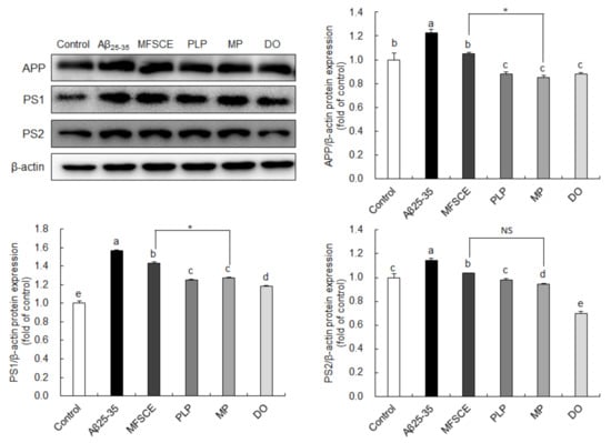 To determine whether the observed improvement of learning and memory function and antiapoptotic effect are associated with APP processing, we analyzed APP, PS1, and PS2 protein expression levels by Western blotting. As shown in Figure 6, significant increases in APP protein levels were observed in the Aβ25–35-injected group compared to the control group, whereas PLP and MP significantly downregulated APP protein expression. In addition, PS1 and PS2 expressions were significantly higher in the Aβ25–35 groups compared to the control group. However, PS1 and PS2 expressions in the brain were significantly reduced by treatment with PLP and MP. In particular, MP showed considerably lower APP and PS1 protein levels in the brain compared to treatment with MFSCE or PLP only. These findings further indicate that the combination of MFSCE and PLP may prevent the progression of AD pathology by inhibiting the amyloidogenic pathway.