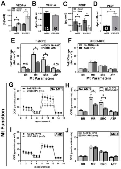 Basal characterization of haRPE and iPSC-RPE. (A,C) Quantification of VEGF-A (A) and PEDF (C) from apical and basal chambers of transwell plates for both haRPE and iPSC-RPE. (B,D) Ratio of apical/basal VEGF-A (B) and PEDF (D). (E,F) Mitochondrial (Mt) functional parameters calculated from OCR traces comparing disease states within haRPE (E) or iPSC-RPE (F). (G,I) Traces of the oxygen consumption rate (OCR) for haRPE and iPSC-RPE. (H,J) Mitochondrial functional parameters calculated from OCR traces. Sample size is indicated in each panel. * denotes p < 0.05.