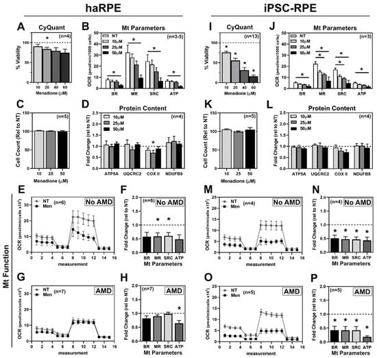 Response to the mitochondrial stressor menadione. haRPE (A–H) or iPSC-RPE (I–P) were treated with different doses of menadione for 24 h. (A,I) Cell viability measured under non-confluent conditions. (B,J) Mitochondrial (Mt) function as measured by CMST. (C,K) Cell count under confluent conditions. (D,L) Quantification of mitochondrial proteins. (E,M) OCR trace from No AMD donors for no treatment (NT) or after treating with 25 μM menadione. (F,N) Mitochondrial functional parameters for No AMD donors. (G,O) OCR trace from AMD donors for no treatment (NT) or after treating with 25 μM menadione. (H,P) Mitochondrial functional parameters from AMD donors. Sample size is indicated in each panel. * denotes p < 0.05.