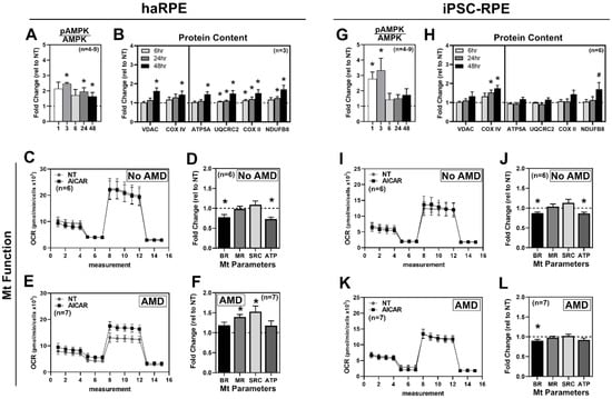 Response to AICAR. haRPE (A–F) or iPSC-RPE (G–L) were treated with 500 μM AICAR, then assayed at the indicated time. (A,G) pAMPK to AMPK ratio from Western immunoblots. (B,H) Quantification of mitochondrial proteins. (C,I) OCR trace from No AMD donors for no treatment (NT) or after treatment. (D,J) Mitochondrial (Mt) functional parameters from No AMD donors. (E,K) OCR trace from AMD donors for no treatment (NT) or after treatment. (F,L) Mitochondrial functional parameters from AMD donors. Sample size is indicated in each panel. * denotes p < 0.05.