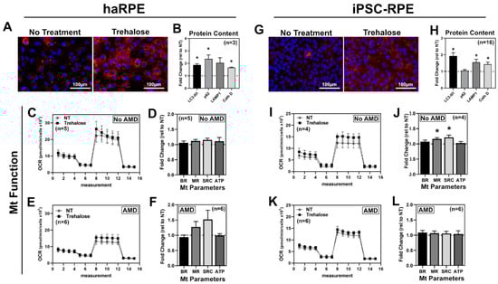 Response to trehalose. haRPE (A–F) or iPSC-RPE (G–L) were treated with 100 mM trehalose for 48 h. (A,G) Lysotracker (red) and nuclei (blue) max-intensity projections of 20× magnification images from no treatment (left) or after trehalose treatment (right). (B,H) Quantification of autophagy and lysosmal proteins. (C,I) OCR trace from No AMD donors for no treatment (NT) or after treatment. (D,J) Mitochondrial (Mt) functional parameters from No AMD donors. (E,K) OCR trace from AMD donors for no treatment (NT) or after treatment. (F,L) Mitochondrial functional parameters from AMD donors. Sample size indicated in panel for each assay. * denotes p < 0.05.