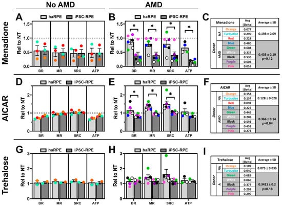 To reduce technical variability, cells from the same donor were treated and assayed for mitochondrial function on the same plate. Data were analyzed by a paired t-test to determine if the response of haRPE and iPSC-RPE were significantly different. Bar graphs show the average response to each treatment with data points from individual donors superimposed over each bar, along with the results of the paired t-test (Figure 5A,B,D,E,G,H). We found no significant difference between haRPE and iPSC-RPE generated from donors without AMD. When comparing haRPE and iPSC-RPE generated from AMD donors, we observed significant differences in their response to menadione and AICAR (Figure 5A,D). Trehalose treatment showed no significant differences between haRPE and iPSC-RPE, likely due to the limited effect on mitochondrial function as measured by the CMST assay.