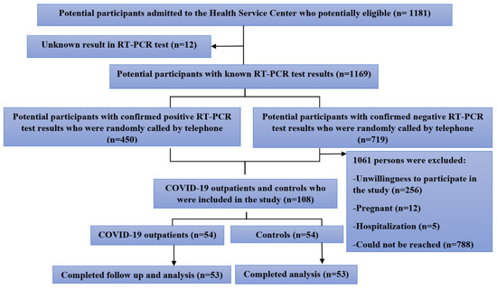 Participants were assigned to one of two study groups: COVID-19 outpatients and controls. Participants in the COVID-19 outpatient group had a positive RT-PCR test for SARS-CoV-2 infection, while those in the control group had a negative RT-PCR result.