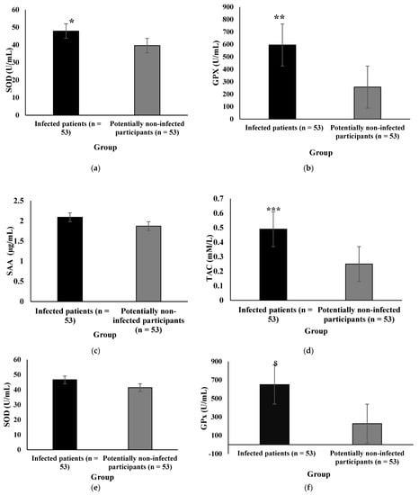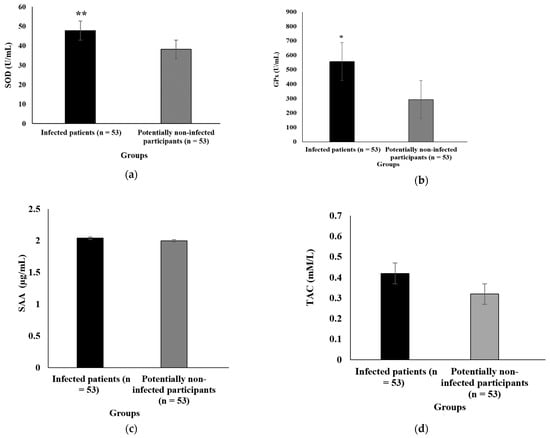 The enzymatic antioxidant system, including superoxide dismutase (SOD) and seven dependent glutathione peroxidases (GPx), is the primary endogenous enzyme defense system of all aerobic cells; these enzymes directly remove superoxide and hydrogen peroxide radicals by converting them to reactants and thereby provide protection []. SOD catalyzes the separation of the superoxide radical (O2●−) into hydrogen peroxide (H2O2). Although H2O2 is not a radical species, it is rapidly converted to OH radicals by the Fenton reaction, which is highly reactive []. One study showed that in children with acute pneumonia, enzymatic antioxidant activities associated with the antioxidant enzymes SOD and GPx and non-enzymatic enzymes associated with reduced glutathione were significantly reduced, and oxidative stress was increased []. However, no prior investigation has evaluated SOD and GPx levels in patients with SARS-CoV-2 infection. There is only one study that evaluated other markers of antioxidant status in this population and reported that catalase activity, serum levels of SOD, total oxidant status (TOS), and malondialdehyde (MDA) were significantly higher in cases (non-ICU and ICU patients) with SARS-CoV-2 infection compared to the control group []. Total antioxidant capacity (TAC) is another biomarker often used to assess oxidative stress in many pathological conditions and reflects the cumulative effect of all antioxidants existing in the blood and body fluids []. Serum concentrations of TAC seem to provide strong evidence of the role of free radicals (FRs) in the pathogenesis of diseases []. Studies on various neurodegenerative diseases, kidney disease, diabetes, and cardiomyopathy have shown a decrease in TAC compared to healthy individuals [,,,,]. However, evidence focusing on the antioxidant and inflammatory status of outpatients with COVID-19 disease is limited. Available evidence reports lower concentrations of total antioxidant status among COVID-19 patients who require intensive care unit (ICU) support than those who do not need the ICU []. Furthermore, TAC activity in non-ICU COVID-19 patients did not significantly differ from that in healthy individuals []. Due to the insufficient evidence on the inflammatory and antioxidant status of COVID-19 outpatients and the inconsistency of available research, there is a need to assess these components. Therefore, this study aimed to investigate the underlying cause of the disease in more depth by comparing the serum concentrations of TAC, SAA, SOD, and GPx between COVID-19 outpatients and controls.