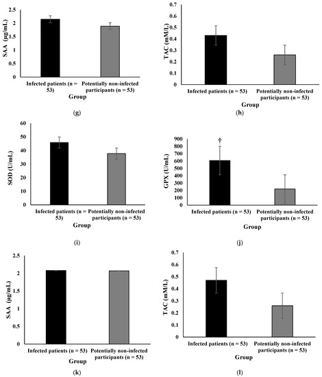 Comparison of SOD, GPx, SAA, and TAC serum concentrations in COVID-19 outpatients and controls after adjusting for the use of vitamin D supplements (a–d), all dietary supplements (e–h), and vitamin C supplements (i–l). An independent sample t-test was applied to analyze data. SOD (a), GPx (b), and TAC (d) concentrations were significantly higher among COVID-19 outpatients than in controls after adjusting for the use of vitamin D supplements. GPx was significantly higher among COVID-19 outpatients than in controls after adjusting for vitamin C (j) and all dietary supplements (f). GPx, glutathione peroxidase; SAA, serum amyloid A; SOD, superoxide dismutase; TAC, total antioxidant capacity. * p = 0.003, ** p = 0.022, *** p = 0.028, ⸹ p = 0.005, and † p = 0.003.