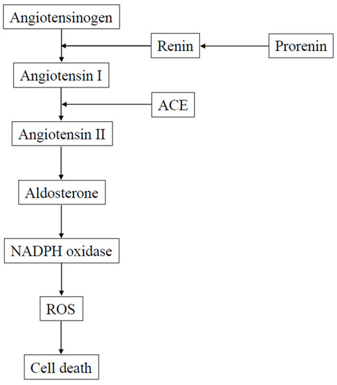 It has been shown that the inner retina, including RGCs, is damaged seven days after retinal ischemia-reperfusion injury [65]. Release of glutamate from the rat retina was observed during the ischemic period, and a large increase was observed during reperfusion [66]. In ischemia-reperfusion, neurotransmitters overactivate their appropriate receptors. Such overstimulation, particularly of ionotropic glutamate receptors, generally leads to cell death. RGC survival rates at seven days after retinal ischemia-reperfusion injury were 46–58% [65,67,68]. However, prevention of retinal ischemia-reperfusion injury can be achieved by administering a direct renin inhibitor [67], ACE inhibitor [65], AT1-R antagonist [65,69], or MR antagonist [68]. Blocking the RAAS at its point of origin, the renin-angiotensinogen interaction can be achieved by the use of direct renin inhibitors, which are antihypertensive drugs [70]. As a result, conversion of angiotensinogen to Ang I is prevented, which leads to the interruption of the RAAS cascade. The formation of Ang II from Ang I can be prevented by ACE inhibitors. This then reduces the action of Ang II at both the AT1-R and AT2-R. However, it should be noted that AT1-R antagonists have been shown to act more selectively by blocking the action of Ang II at the AT1-R. It has been shown that at 12 h after reperfusion, the protein levels of AT1-R are upregulated in the retina [65]. In addition, at 12 h after reperfusion, an increased ROS production is observed in the retina, with the increased levels associated with an increase in the p47phox and p67phox mRNA expressions [69]. These findings suggest that an NADPH oxidase pathway at 12 h after reperfusion is responsible for mediating the ROS production in the retina. Another study has shown that administration of the AT1-R antagonist, candesartan, was able to prevent the ischemia-reperfusion injury-induced increase of both retinal ROS levels and NADPH oxidase expression [69]. Thus, these results demonstrated that one of the main pathways of retinal ischemic injury is via the local RAAS. A complete reversal of the RAAS suppression-induced neuroprotective effect against the retinal ischemia-reperfusion injury was also observed after the administration of aldosterone in rats receiving an AT1-R antagonist [68]. Moreover, a neuroprotective effect against retinal ischemia-reperfusion injury was observed with the MR antagonist [67]. When taken together, these findings demonstrate that ischemic damage in the retina can be influenced by MR and aldosterone. Figure 1 presents the details on a possible mechanism associated with the retinal neuronal cell death mediated by the local RAAS.