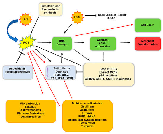 Van der Kemp et al. demonstrated that melanocytes irradiated by UV generate H2O2 in a dose-dependent fashion coupled with a reduced catalase and HO-1 activity and that UVB irradiation is able to inactivate the OGG1 protein, a key element of the base excision repair (BER) system [,,]. The observation that oxidative stress contributes to the genesis of melanoma is reinforced by the discoveries that mutations in melanoma-associated genes are a consequence of oxidative stress or contribute to worsening the oxidative stress condition. It has been reported that melanocytes are more sensitive to p16 depletion than keratinocytes or fibroblasts, and this depletion can significantly increase ROS levels, thus possibly explaining the association of p16 mutations with melanoma []. Furthermore, the loss of PTEN was found to be associated with melanoma progression, apparently due to boosted superoxide anion production consequential to the constant activation of Akt, and the loss of function for the alleles of the gene encoding for the protein MC1R is correlated with an increased risk to develop melanoma due to increased oxidative stress in melanocytes resulting from the failure to respond to α-MSH [,]. It was suggested that even the activating V600EBRAF mutation, a somatic mutation frequently expressed in nevi and melanoma, could be the result of a sustained oxidative stress process []. Null polymorphisms of two genes belonging to the glutathione S-transferase family of antioxidant genes, GSTM1 and GSTT1, have been correlated with an increased risk to develop melanoma, specifically in subjects with sunburns that occurred in childhood []. Furthermore, one single nucleotide polymorphism of the glutathione S-transferase gene GSTP1 that diminishes the enzyme activity has been correlated with melanoma predisposition, with a synergic effect when co-present with alternative alleles of MC1R [].