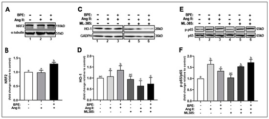 Blueberry polyphenol extract (BPE) increases the expression of NRF2 and HO-1 while reducing NF-κB p65 phosphorylation in angiotensin (Ang) II-treated human aortic endothelial cells (HAECs). HAECs were treated with 200 µg/mL of BPE for 1 h then treated with 200 nM of Ang II for 12 h. Protein expression of NRF2 (A,B), HO-1 (C,D), and NF-κB p65 (E,F) were determined by Western blot. Quantification was performed using Image Lab (Bio-Rad Laboratories, Inc.). Data are expressed as mean ± SD from nine (HO-1), and three (NRF2 and NF-κB) independent experiments. Values that do not share the same letter are significantly different from each other (p ≤ 0.05).