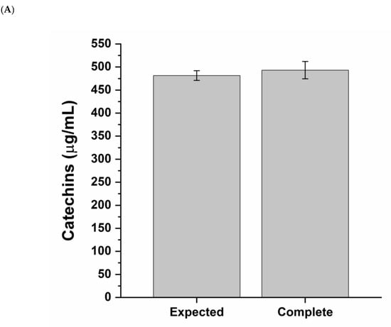 The bioaccessibility of a dietary supplement refers to the active components released from its matrix in a form available for absorption. To determine the bioaccessible fraction of Abigenol®/AlbiPhenol®, a single dose (150 mg) was exposed to an in vitro digestion procedure mimicking the human digestive process in the adult. Then, the total amount of catechins was compared to the amount of soluble catechins released from the matrix (bioaccessible fraction, which includes the portion available for absorption). As can be seen in Figure 1 and Table 1, Abigenol®/AlbiPhenol® is endowed with good bioaccessibility, considering the lipophilic nature of its active compound, since about the 50% (255.0 ± 14.5 µg/mL) of catechins contained in the extract was released from the matrix during the digestion (Figure 1B). Furthermore, Abigenol®/AlbiPhenol® was highly resistant to the digestive process. Indeed, the amount of catechins measured at the end of the in vitro digestive process was equivalent to the expected amount (493.2 ± 18.7 vs. 481.6 ± 10.7 µg/mL) (Figure 1A). However, only a relevant catechin fraction (about 43%) was non-bioaccessible and excreted through the feces (Figure 1B).