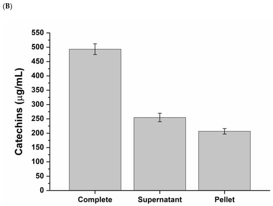 Catechins content of Abigenol®/AlbiPhenol® (A) at the end of the processing phase and (B) in the supernatant and pellet fractions.