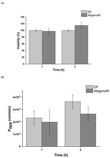 Cell vitality (A) and apparent permeability (Papp) (B) of intestinal epithelia exposed to digestive fluids (DF; control) and digested Abigenol®/AlbiPhenol® (n = 3).