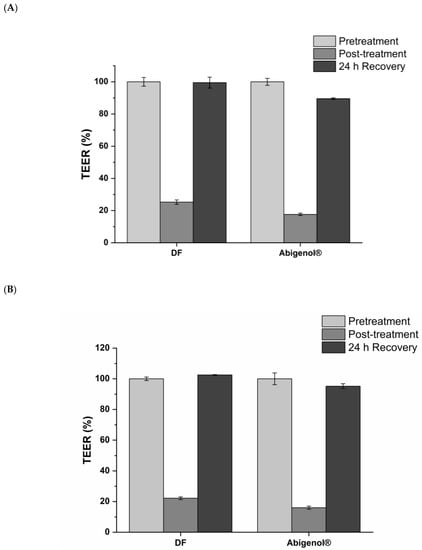 TEER values before the treatment (pre-treatment), after exposure to digestive fluids (DF) or digested Abigenol®/AlbiPhenol® (post-treatment) for 1 h (A) and 3 h (B) and after 24 h of recovery. Values are expressed as a percentage of the pre-treatment TEER value (n = 3).